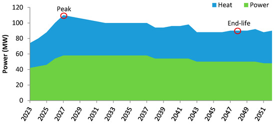 As a starting point for the evaluation of the feasibility to cogenerate power and heat through combined cycles in offshore installations, an actual case study was considered. The Johan Castberg field is located 110 km north of the Snøhvit-field in the Barents Sea. A floating production, storage and offloading vessel (FPSO) concept has been selected as the field production unit. The first oil is expected by 2023 and the production phase is assumed to last until 2052. The power and heat requirements to operate the plant are strongly influenced by the crude oil production profile. An estimation of those requirements through the field’s lifetime was made publically available by the operators of the plant in 2016 [28]. In accordance with the information available, profiles of power and heat demands were developed where each year is characterized by values representing averaged power and heat requirements for that year (see Figure 1). The heat to the process units is assumed to be supplied through pressurized water in a separate heating circuit. The process supply temperature needed is highly dependent on the conditions and the characteristics of the crude oil (e.g., initial feed temperature, viscosity, content of medium-weight hydrocarbons, etc.), and on the processes to be implemented (separation, crude oil stabilization, gas dehydration, etc.). Without a complete knowledge of that set of information, it was decided to use either 150 °C or 120 °C as assumed process supply temperature. A rather high heat demand characterizes the case study selected. Such large heat-to-power ratio is not often found in offshore installations and it is challenging to be fully met by a combined cycle in cogenerative mode. Therefore, in order to encompass a larger range of possible applications, the analysis was not limited to the retrieved power and heat profiles but included an additional case in which only half of the heat demand initially considered is to be supplied. This could be the case of the selected plant where half of the heat demand is covered by alternative equipment or the case of a different plant with more limited process heat requirements. Summing up, four different cases were evaluated: