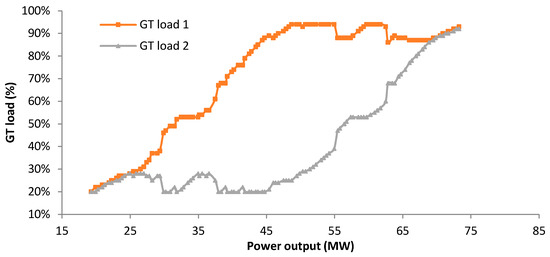 Example of optimum load share between two topping gas turbines of a combined cycle.