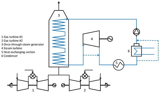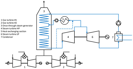 The first configuration investigated consists of a combined cycle operated in a cogeneration mode with a backpressure ST. A simplified representation of the cycle layout is shown in Figure 3. The pressure at the outlet of the ST is determined according to the process supply temperature and the thermal load requested by the processing plant. All steam from the turbine is sent to the heat exchanging section where it transfers heat to pressurized water in the heating medium loop (i.e., the cold side of the generic heat exchanger). The conditions at the outlet of the hot side of the generic heat exchanger depend on the thermal load demand. Typically, a two-phase flow is expected which is further cooled in a deaerating condenser. In the case of high thermal loads, saturated water could be obtained which bypasses the condenser. The possibility for a fraction of the live-steam to bypass the ST is also modeled in order to control the maximum live-steam pressure and to ensure the capability to meet the heat demand in any circumstance.