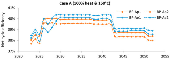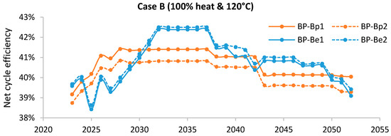 Models of the combined cycle were developed according to the outputs of the design optimization process. Off-design simulations were run, in accordance with the power and heat requirements scenario selected. The main outputs of the off-design simulations are shown in Table 5, while the annual performance is shown in Figure 4, Figure 5, Figure 6 and Figure 7. As a premise, some general considerations on the average net cycle efficiency —calculated as the average between the efficiencies in all the off-design conditions evaluated—should be made. It can be noted that particularly low values were achieved in comparison to a more conventional combined cycle plant. Different factors contributed to this outcome. In the first instance, the large process heat demand of the cases studied significantly decreased the power output which could be generated by the cycle and, thus, the . In addition, the designs developed had as additional objective to limit the overall weight. If the only objective function was to minimize the HR, more efficient cycles would have been defined. Furthermore, the variable heat and power demands entailed low part-load conditions in many instances with a consequent reduction of the average efficiency. In all the cases studied, the designs selected as compromise between good efficiency and limited total weight (BP-Ap1 and BP-Ae1 for the case A, BP-Bp1 and BP-Be1 for the case B, BP-Cp1 and BP-Ce1 for the case C, and BP-Dp1 and BP-De1 for the case D) resulted in combined cycles significantly heavier for the peak designs than for the end-life designs (between +16.8% and +21.5%). This was somehow expected, as for a larger power output there is a larger thermal energy available from the exhausts of the GTs. Thus, the bottoming combined cycle was designed to exploit such increased waste energy available, with a consequent increase of sizes and weights. However, it was also expected a better efficiency of the cycle. This was verified only for the cases C and D characterized by half of the heat demand where the was slightly higher for the peak designs compared to the end-life designs leading to lower cumulative CO2 emissions (a 2.2% and 0.9% reduction, respectively for cases C and D), calculated as: