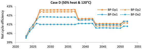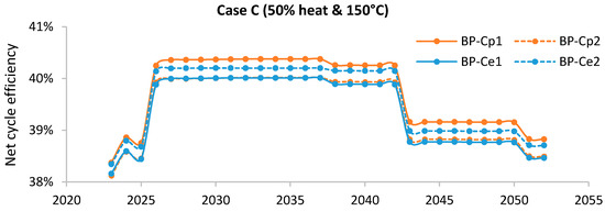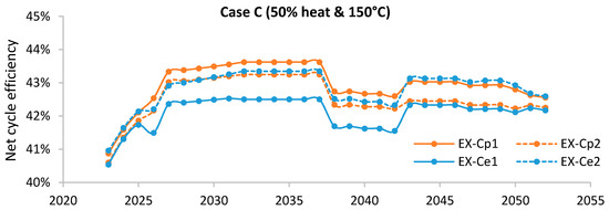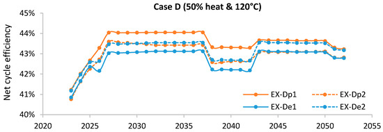 Models of the combined cycle were developed according to the outputs of the design optimization process. Off-design simulations were run, in accordance with the power and heat requirements scenario selected. The main outputs of the off-design simulations are shown in Table 8, while the annual performance is shown in Figure 9 and Figure 10. Similar considerations to those outlined for the backpressure steam turbine cycle could be made to explain the low values of average net cycle efficiency achieved. The designs selected as compromise between good efficiency and limited total weight (EX-Cp1 and EX-Ce1 for the case C, and EX-Dp1 and EX-De1 for the case D) resulted in combined cycles significantly heavier for the peak designs than for the end-life designs (+14.9% and +16.6%, respectively for case C and D). The reason was the larger thermal energy available from the exhausts of the GTs which, in order to be exploited, demanded larger heat transfer surfaces and, ultimately, augmented sizes and weights of the bottoming cycle equipment. To this increase in the weights, it was supposed to correspond a better cycle efficiency. This was verified to a certain extent. The was slightly higher for the peak designs compared to the end-life designs leading to lower cumulative CO2 emissions (a 2.1% and 1.9% reduction, respectively for case C and D). In order to assess the relative performance of the two design approaches at equal conditions, the outputs of the designs with similar total weight were further analyzed (EX-Cp2 and EX-Ce2 for the case C, and EX-Dp2 and EX-De2 for the case D). The lifetime performance of the end-life designs was better compared to that of the peak designs, with an increase of the leading to a reduction of cumulative CO2 emissions of 0.6% and 0.4%, respectively for case C and D. The end-life designs, being optimized for the end-life conditions, performed more efficiently in the tail years of plant’s operation. In the peak years, though, the peak designs did not outperform the end-life designs as could be expected whereas the performances were rather similar. The main reason for this outcome was that the gap in efficiency in the bottoming cycle of the end-life designs tended to be closed by the higher loads at which the GTs were operated. It is known that for a common combined cycle the GT is responsible for the largest share of total power output. This fact was even more stressed in the system here investigated since the bottoming cycle power output was decreased in order to be able to meet also the heat requirements and, in particular, at peak conditions when the heat demand is larger. Thus, the efficiency of the GT simple cycle weighed much more than that of the steam bottoming cycle and the GT efficiency increase, due to the higher GTs loads, positively contributed to the overall efficiency in the end-life designs. Summing up, high efficiency can be achieved with the peak design approach but with large total weight of the bottoming cycle. If the total weight has to be limited, the end-life designs proved to return slightly better performance throughout the entire lifetime.