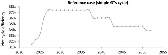 In order to provide a complete overview, the effectiveness of the combined cycle configurations studied needed to be compared to a reference case. The common practice in offshore oil and gas installations is to use simple GT cycles to generate power. The process heat is normally obtained by exploiting the thermal energy in the exhaust GT gases by means of WHRUs. A reference case model was developed to simulate this common layout. Two GTs (2 X GE LM2500 + G4) were modeled and their operation planned in order to meet the power demand throughout the plant’s lifetime. The load was evenly shared between the two GTs, as this is the typical operational strategy implemented. A model of the WHRU was not developed but it was verified that in every operating conditions simulated, the exhaust gases would be thermodynamically able to cover the process heat requirements. The simulation throughout the plant’s lifetime returned a of 35.6% and cumulative CO2 emissions of 7.93 Mton. A breakdown of the net cycle efficiency evolution throughout the years is shown in Figure 11. A significant variability of the efficiency can be noticed, in line with the typical performance decay of a GT at part-loads.