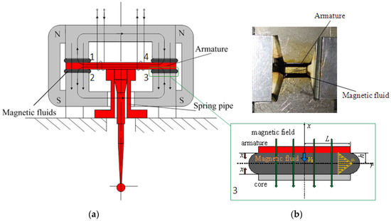 As shown in Figure 1, when the armature rotates, the working gaps of the torque motor will become smaller or larger. The function of magnetic fluids inside the gaps can be regarded as a spring with a tunable stiffness and a damper. As the movement of the end of the armature is required to be small by the stability criteria of the servovalve, it is usually less than one-third of the working gap (0.2 mm in this paper). Therefore, the movement of the end of the armature can be regarded as a displacement along the direction of the magnetic field exerted inside the working gap, although the armature actually rotates when the electric current is supplied to the torque motor. The operation mode of the magnetic fluids can be taken as a squeeze mode due to the displacement of the armature.
