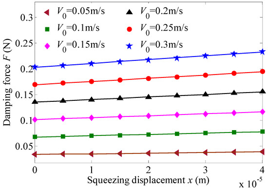 If the armature stays at the neutral position, then h and L in Figure 1 are 0.375 mm and 2.5 mm, respectively. When the armature rotates, the maximum displacement and velocity of the armature end is 76.9 μm and 0.54 m/s, respectively. For the squeeze working mode in Figure 1, the displacement of the armature x is less than 40 μm, and the velocity of the armature V0 is 0.05–0.3 m/s. As the displacement of the armature is small enough, linear characteristics of the damping force on the armature due to the magnetic fluid working in the squeeze mode in the working gaps of the torque motor can be assumed and expressed simply as