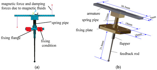 By applying the mathematical model in Equation (3) and the parameters calculated from the experimental data for the mathematical model, the damping force from magnetic fluids can be considered in the vibration mode and harmonic response analysis of the armature with FEM. The geometry model of the armature assembly with meshes and boundary conditions is shown in Figure 3a for the analysis of vibration modes. In the analysis, the armature is fixed at the flange of the spring pipe. Magnetic force due to the input electric current of the torque motor is exerted on the end of the armature. When the input electric current is 0.01 A, the magnetic force can be calculated as 0.086 N. Assuming that the damping ratio for the Rayleigh vibration model is constant for the frequency range of interests, it is taken as 0.03 in the analysis from experience.