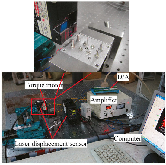 The tested sample of armature is shown in Figure 3b, and the experimental setup to test the vibration of the armature is shown in Figure 4. The torque motor from an electro-hydraulic servovalve (Chinese servovalve manufacturer, SL100, Beijing, China) was separately installed on a support from the main valve. Sinusoidal electric current signals were applied to exert the magnetic force on the armature with frequencies up to 4500 Hz. With the aid of a high-speed laser displacement sensor (LK-G5000, Keyence, Osaka, Japan), the harmonic responses in the x direction at the end of the feedback rod were measured both when magnetic fluids in the torque motor were applied and when they were not. The experimental data was transferred to a computer through the data acquisition system.