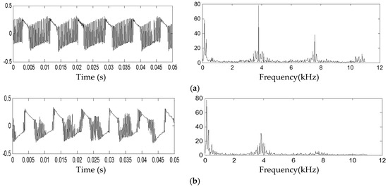 Tested results of self-excited noise inside the servovalve. (a) The tested noise wave and FFT analysis results without magnetic fluids; (b) the tested noise wave and FFT analysis results with magnetic fluids.