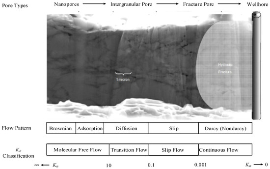 The gas in shale gas reservoirs includes gas adsorbed on organic matter and inorganic mineral surfaces and free gas in fractures and pores [8,9]. Using Scanning Electron Microscopy (SEM) methods Javadpour et al. [10], Locks et al. [11] found that the main pore size of shale matrix is in the range from 1 to 200 nm. Due to the existence of nanopores, the widely used Darcy’s law cannot accurately describe gas flow in shales. Based on the work from Beskok and Karniadakis [12], Swami et al. [13] divided gas flow in shales into four regimes, including viscous flow (Kn ≤ 0.001), slip flow (0.001 ≤ Kn ≤ 0.1), transition flow (0.1 ≤ Kn ≤ 10) and Knudsen flow (Kn ≥ 10). The gas transport in shale nanopores is a complex combination of all these flow mechanisms, which cannot be described by Darcy’s law [14]. In addition, the adsorption and desorption process also exist in the pores with adsorbed gas on organic matter and inorganic mineral surfaces.