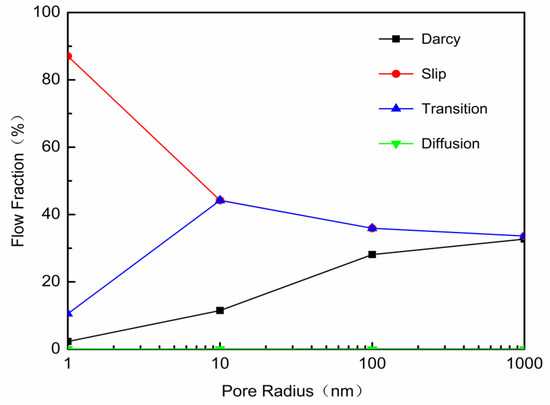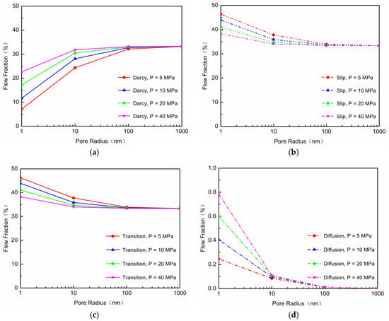 Figure 3 presents the effects in different pressures where four cases were calculated by varying pressure from 5 MPa to 40 MPa to study different flow patterns in shale nanopores. From the results of Figure 3, it is known that the flow fraction of Darcy and molecular free flow increases with increasing pressure, but the slip and transition flow decreases. When pressures are constant, with increasing pore radius, the slip and transition flow slows down while the Darcy and molecular free flow gradually rise.