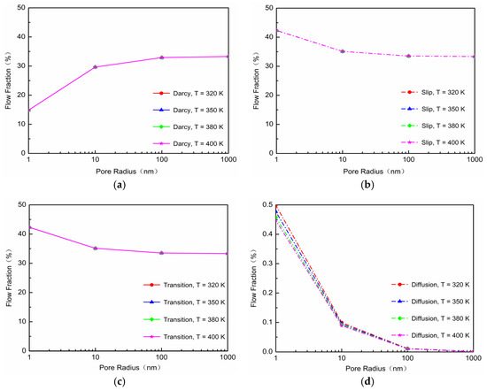 Gas flow fraction versus pore radius for various temperatures. (a) The fraction of Darcy flow; (b) the fraction of Slip flow; (c) the fraction of Transition flow; and (d) the fraction of Diffusion flow.
