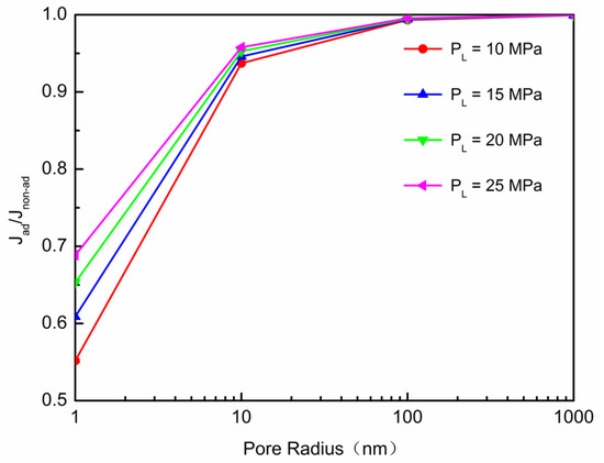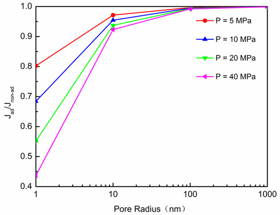 Figure 7 shows the effects in different pressures where four cases from 5 MPa to 40 MPa are considered to study gas flow in shale nanopores. From the result of Figure 7, with increasing pressure in shale nanopores, the Jad/Jno-ad ratio will decrease when the pore radius is constant. The total mass flux decreases as pressure increases. However, for a given pressure the Jad/Jno-ad ratio will increase with the increasing pore radius. It means that the total mass flux will increase as pore size increases when pressure is given.