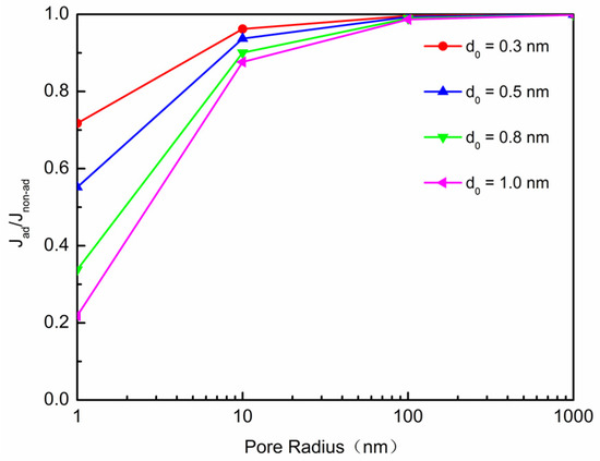 The adsorption thickness values from 0.3 nm to 1 nm are chosen to study the effect of adsorption thickness on gas flow in shale nanopores. The Jad/Jno-ad ratio versus pore radius is illustrated in Figure 6. From the results of Figure 6, it is seen that the Jad/Jno-ad ratio will decrease with adsorption thickness for a given pore size. In other words, with increasing adsorption thickness, the total mass flux will decrease. When pressure is constant, the Jad/Jno-ad ratio will increase with the rising pore radius. It means that the total mass flux will increase as the pore radius increases.