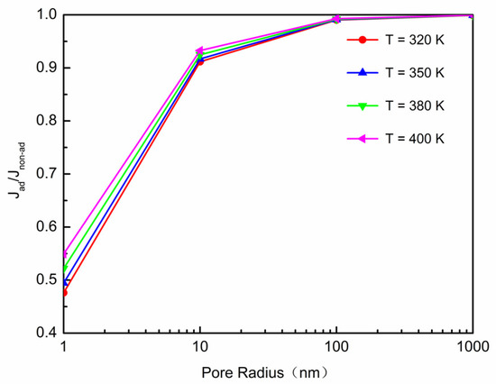 The values of different temperatures between 320 K and 400 K are conducted to investigate the effect of adsorption thickness on the gas flow in shale pores. The variation of the Jad/Jno-ad ratio versus pore radius is shown in Figure 8. As illustrated in Figure 8, it is seen that as temperatures increase, the Jad/Jno-ad ratio increases for a given pore radius. It means that the elevated temperature favors total mass flux. When pressure is constant, the Jad/Jno-ad ratio rises with increasing pore radius. That is, the corresponding total mass flux increases as the pore radius increases.