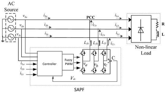 The proposed three-phase SAPF is connected at the point of common coupling (PCC) between the three-phase supply and the nonlinear load, as shown in Figure 1. The nonlinear load consists of a three-phase full bridge rectifier which is further connected to an inductive (RL) load. The SAPF operates by injecting compensation current into the utility via PCC to cancel out the current harmonics and at the same time drawing a small amount of current from the utility to regulate its switching losses. It can be used to eliminate current harmonics and compensate reactive power at the source side. The instantaneous current and the source voltage are expressed as follows: