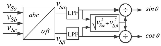 Next, for generating the synchronizing vector, instantaneous source voltages are sensed and then computed. The process involves transforming three-phase supply voltage to α-β voltage by the Clarke transformation as in Equation (11). The output of the Clarke transformation is the voltage in α-β coordinates, which can be simplified as in the equations below.