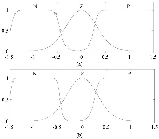 - For the two input variables, three fuzzy sets are configured involving two Bell functions and one Gaussian membership function, that are N (negative), Z (zero), and P (positive), as shown in Figure 4.
