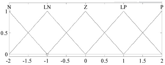 - In the case of output variables, five fuzzy sets comprised of the triangular membership function are configured as shown in Figure 5, N (negative), LN (less negative), Z (zero), LP (less positive), and P (positive).
