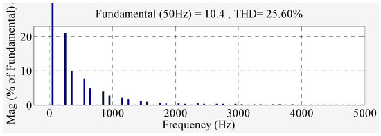Figure 7 shows the output waveform of the unit vector synchronizer: the sine and cosine function needed for synchronization purposes and for the generation of reference current signals. It is clear that the sine and cosine functions are effectively generated, thus ensuring proper generation of the required reference current signals. Meanwhile, Figure 8 shows the source voltage and current waveforms before compensation. The result reveals that before connecting SAPF, the source current is clearly distorted as a result of the harmonics generated by the non-linear load. The distorted current shows that the load current component now comprises both the fundamental and harmonics signals. According to the fast Fourier transform (FFT) analysis shown in Figure 9, the THD value obtained as a result of the harmonic distortion in the current signal is 25.60%. In order to reduce the harmonics in the power system, SAPF is applied by injecting compensation current at the PCC.