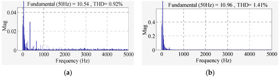 On the other hand, Figure 10 shows the FFT analysis of the source current after connecting the SAPF. It is clear that SAPF using the proposed current control scheme (with the FLC controller) has effectively reduced the high THD value of the source current from 25.60% to 0.92%. Meanwhile, SAPF without the FLC controller performs poorly with a THD value of 1.41%. In other words, by using the proposed FLC-based current control scheme, the THD value of the source current can be further reduced by 0.49%.