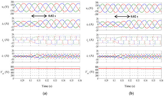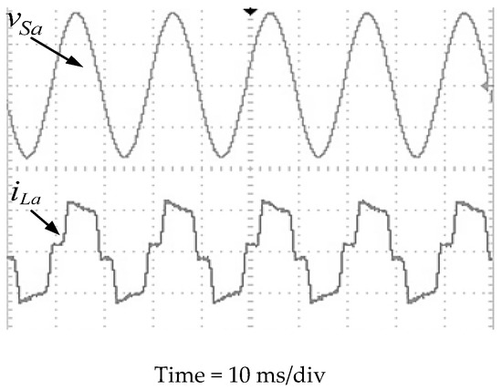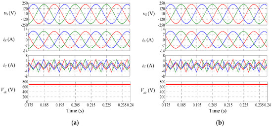 In order to mitigate the harmonic currents, SAPF is applied to the system to cancel them out by injecting the compensation current at PCC. Figure 16 shows experimental results which includes the phase a source voltage , source current , load current , and compensation current waveforms resulting from the SAPF utilizing the current control scheme with and without FLC. From the results, it shows that in both cases the source current is now sinusoidal and in phase with the source voltage. However, the SAPF using the proposed current control scheme (with the FLC controller) is revealed to have effectively mitigated the harmonics with a THD value of 5.07%. Meanwhile, the SAPF without the FLC controller performs poorly with a high THD value of 7.40%. In other words, by using the proposed FLC-based current control scheme, the THD value of the source current can be further reduced by 2.33%. Figure 17 and Figure 18 provide similar observations on the sinusoidal and in phase behavior of the source current. Next, Figure 19 presents the steady-state DC side voltage of the SAPF utilizing the current control scheme with and without FLC. In both cases the is approximately 230 V.