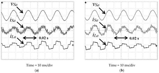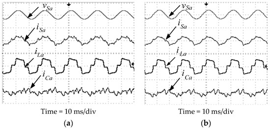 Steady-state experimental result showing the phase a source voltage (200 V/div), source current (20 A/div), load current (10 A/div), and compensation current (10 A/div), resulting from SAPF (a) with FLC and (b) without FLC.