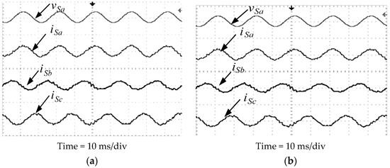 Steady-state experimental results which include the phase a source voltage (200 V/div) and three-phase source current , , and (20 A/div), resulting from SAPF (a) with FLC and (b) without FLC.