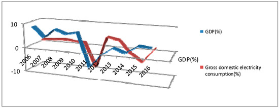 Correlation between GDP and gross national electricity consumption in Romania. Source: authors’ representation based on information extracted from the Romanian National Institute of Statistics [34].