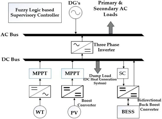 The main architecture of the proposed system is composed of: a PV-based distributed generation, small wind turbine system (WT), synchronous diesel generator (SG), battery energy storage system, DC heat generation system as dump load, fuzzy logic based supervisory control and management system, bidirectional buck-boost converter, super capacitors, inverter between DC and AC (alternating current) bus. The whole system is then connected with the various primary and secondary loads as shown in Figure 1.