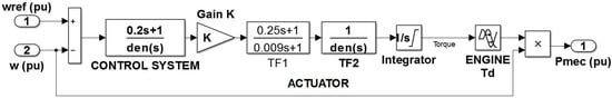 The system stabilizes itself after a short period of time due to the operation of a speed control system and the power input to the generator stabilizes to the required level. Due to the operation of the excitation system [23], voltages at the generator terminals are also maintained at the load demand. If the load demand is greater than the generated power, then it eventually results in a decrease in the frequency of the output. In diesel engine governor block, the reference rotor speed is already defined and using a feedback system, the rotor speed of the generator is also input to get the error value between two speeds to perform the function of controlling fuel combustion which results in power with the desired frequency. The internal configuration of a diesel generator governor is shown in Figure 2.
