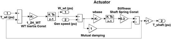 where ρ represents the air density (lb/ft3), νω represents the wind speed (mph), A is the rotor swept area (ft2) and Cp is the maximum power coefficient, which ranges from 0.25 to 0.45. Pitch angle for the pitch controller and wind speed are input to this module. The basic internal configuration of the wind turbine governor can be seen in Figure 3.