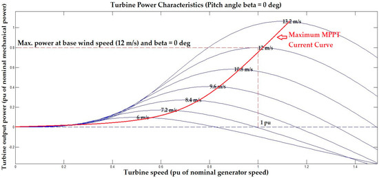 Wind turbine is a system that converts wind’s kinetic energy into mechanical and then electrical power by driving machines and electric generators. The wind turbine model used in this study comprises a wind source, turbine aerodynamics model and permanent magnet synchronous generator (PMSG). The considered turbine model is a horizontal-axis turbine with three blades. The output power of a wind turbine can be calculated by Equation (6):
