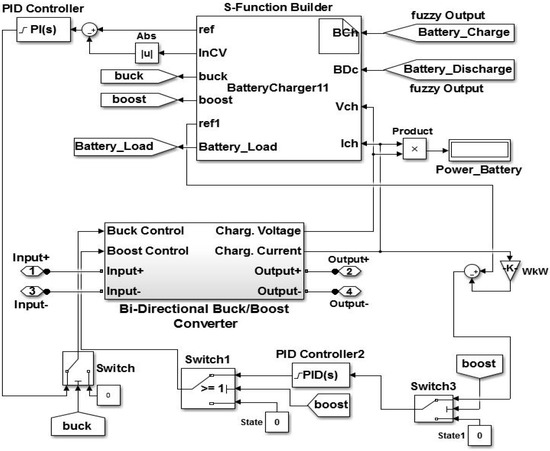 In this equation, Vbat and Ibat are the battery voltages and current, respectively. A 250 V, 120 Ah lithium-ion battery system is used in our proposed system. The battery SOC is limited to 50% as minimum discharging level. The efficient battery charging and discharging mechanism is shown in Figure 5 and explained below. As shown, a bidirectional buck boost converter is used to regulate the voltages according to the battery charging or discharging requirements. A PID controller is also part of the proposed system to adjust PI (proportional-integral) gains depending on the difference of error magnitude between modes to make the system performance smooth and efficient.
