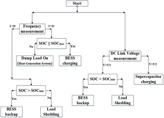 The proposed system consists of a supercapacitor-based DC-link voltage stabilizer and battery energy storage system (BESS)-based frequency stabilizer. Supercapacitors are connected is parallel with the DC-link via a DC/DC buck converter to maintain the DC-link voltage within the specified range while the system is operating at MPPT. The DC/DC buck converter is controlled by a standard PID controller, which is responsible for maintaining the DC-link voltage to 500 V DC. Further voltage increase will be consumed and stored in current form in the supercapacitors. Energy stored in supercapacitors is further used to charge the BESS that is attached to the DC link and supercapacitors via s bidirectional DC/DC buck-boost converter. In case, if the BESS is fully charged and the generated power is still more than the load demand, extra generated power will be supplied to the heat generating system used as dump load. This dump load system will keep consuming the extra power to generate heat until the system scenario changes. In general, any dump load system can be selected to meet the requirement, such as a water pump system, heat generating system, etc. The rest of the system works in normal condition until the DC-link voltage stays within the limits. Another case is an overload scenario, where the diesel generator and renewable energy sources fall short of holding the increased load demand either in form of active power or reactive power. As mentioned earlier, any increase in active power directly affects the frequency and causes a frequency drop, while reactive power drops the output voltage. A fuzzy logic-based supervisory controller is designed for voltage and frequency stabilization. If the active power demand is increased, the diesel generator output frequency will keep dropping below its nominal range. In that case, the fuzzy logic-based controller will detect the frequency drop and generate commands to the bidirectional DC/DC buck-boost converter to provide deficit power. Energy stored in the BESS provides the required power to maintain the output frequency. In the reactive power case, the diesel generator output voltage tends to drop, eventually causing the DC-link voltage to drop too. The fuzzy logic-based supervisory controller will sense this disruption and control the BESS system to provide the required power to maintain the DC-link voltage. If the BESS reaches its minimum capacity as discussed in the next section for a loadshedding case, the secondary loads can be disconnected from the main system to avoid overall system degradation and a complete blackout.