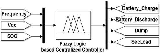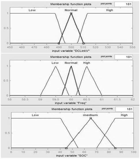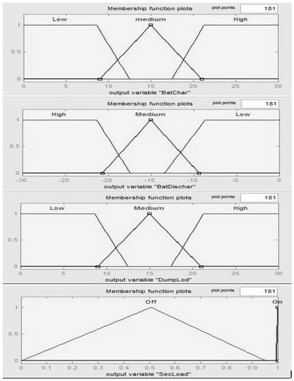 Overlapping membership functions are considered to avoid fluctuations and carry out smooth transitions during switching of various controls and shifting between different modes. There are various membership functions for input such as frequency, DC link voltage and SOC whereas output variables are battery charging/discharging control, dump load controller and secondary loads. Fuzzy logic generates output values with respect to input membership functions according to the designed rule base. Operation of the fuzzy logic-based frequency and voltage stabilization system is briefly discussed in Section 4, where it can be seen working in different scenarios according to current conditions.