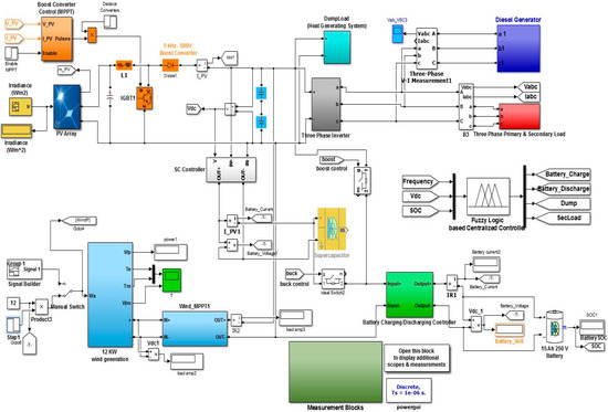 Frequency and voltage stabilization of an AC/DC hybrid standalone microgrid system is briefly described in Section 2 and Section 3. Now the corresponding Matlab/Simulink simulation study is examined in this section. The whole configuration of the proposed system is shown in Figure 11.