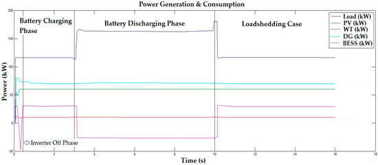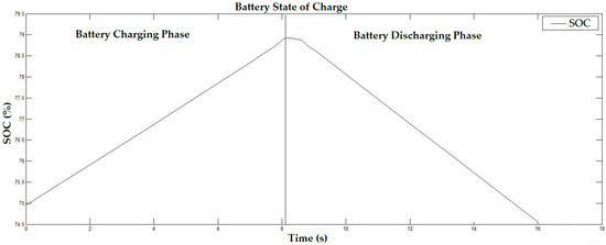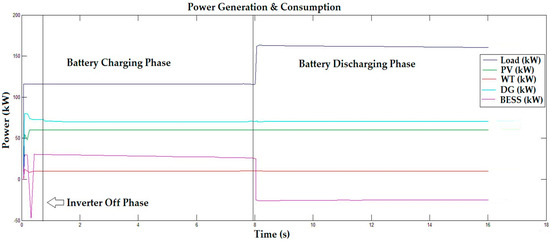 This mode is divided into two parts; i.e., battery charging and battery discharging. Battery charging mode is also the normal mode of operation for our proposed system. Minimum and maximum capacity of the BESS system are 50% and 100%, respectively. Proposed system will work in battery charging mode only if renewable generation system is generating excessive power than load demands and battery system is not charged up to defined level. This will also help to keep microgrid DC link voltage and frequency stabilize. In this situation, the fuzzy logic-based supervisory control system will make the system work in battery charging mode as shown in the first part of Figure 12.