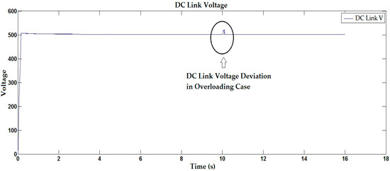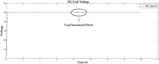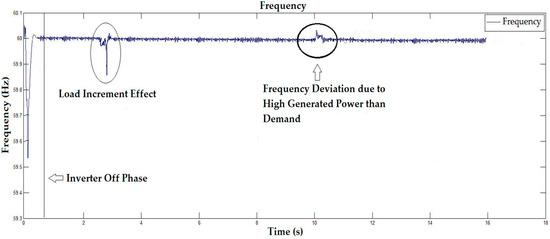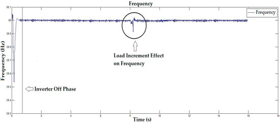 Also the effect of load increment and proposed system efficient response can be seen in the case of DC link voltage and frequency in Figure 13 and Figure 14, respectively.