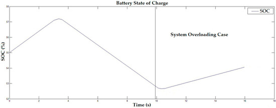 It can be seen that as soon as the frequency drops below the standard value of 60 Hz, the fuzzy controller enables the battery backup system to supply the deficit power to maintain the frequency and system stability. As shown, the frequency is stabilized at 60 Hz again in short time span, even keeping the deviation between the permissible limit of (±0.5). The battery SOC and supercapacitor power consumption can also be seen in Figure 15 and Figure 16.