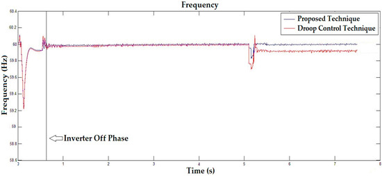 From Figure 21, one can notice that the system frequency restoration and settling around the nominal frequency is much better with the proposed control technique as compared to the previously used droop control technique, as it can be seen that the frequency using the proposed controller settled at almost 60 Hz, whereas using droop control, after high fluctuations it stabilizes on 59.84 Hz approximately.