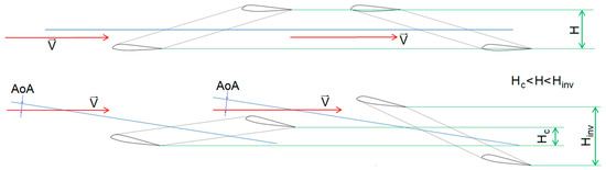 Researchers in Poland became interested in joined wing configurations in the early 1980s. Some results were presented in [14,15], where the author focused on the concept of a firefighting airplane, arguing that it had the potential to provide a 10% better climb rate, 50% higher payload, and 10% wider range between minimum and maximum airspeed. Some flights were also performed with a scaled model of an ultralight airplane in the joined wing configuration that revealed good longitudinal static and dynamic stability, but was very sensitive to center of gravity position change. Some other publications [16,17] concluded that the front wing of the joined wing airplane should be designed in a high wing configuration and the aft wing in a low wing configuration, which is opposite to the most frequently considered case. This is because, as one of conclusions in [7,8] states, the gliding ratio of the joined wing airplane increases together with the vertical aspect ratio. Figure 1 shows that in the case of a conventional joined wing airplane, the vertical distance between the wings decreases with the angle of attack, whereas the same dimension increases with the angle of attack in the case of such an inverted joined wing airplane. In general, the induced drag increases quadratically with the lift coefficient, so it is insignificant when CL is small. At low CL the other drag components are larger than the induced drag, so induced drag reduction attained at the expense of increased friction and/or interference drag does not pay off. However, at large angles of attack, when the lift coefficient is large, on the other hand, the induced drag becomes dominant and so any induced drag reduction that can be attained is valuable. That is exactly the case for the inverted joined wing configuration.