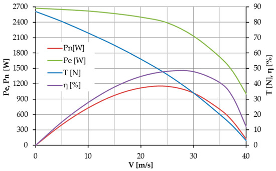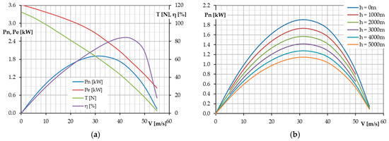 (a) Propulsion unit characteristics: Pe—motor electric power, PN—effective power, η—total efficiency, T—thrust; and (b) power available versus airspeed for several flight altitudes.