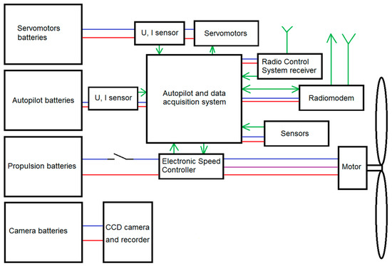 The propulsion system was not the only electric device onboard the demonstrator. It was also equipped with a radio control system (RCS), autopilot and data acquisition system (ADAS), Radiomodem, and charge-coupled device (CCD) Camera. The whole electric/electronic system architecture is presented in Figure 5. Each of the vital systems of the demonstrator was supplied from a separate power source because previous experience shows that a supply from separate sources is important for the safety and accuracy of recorded measurements.