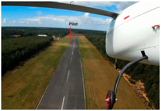 Application of an autopilot allowed for autonomous flights, but this was used only as an emergency option in the case of loss of radio contact. If radio contact was lost, the autopilot would guide the airplane around the airfield until radio contact was recovered. Direct radio control was applied as the main mode of control because the demonstrator was tested to evaluate its handling properties, so the “pilot’s impression” was an important source of information, together with data from various sensors installed onboard. Usually these data are used by the autopilot to calculate signals for servomotors and the propulsion speed controller. In this project, the autopilot only stored them for further analysis and sent some data to the ground control station (GCS) to be displayed for those supervising each test. A CCD camera was also installed onboard since the view from the airplane is quite helpful in flight data analysis. However, it was not transmitted to GCS in real time since the airplane was flying close to the pilot, so control according to the visual line of sight (VLOS) rules was applied (Figure 6).