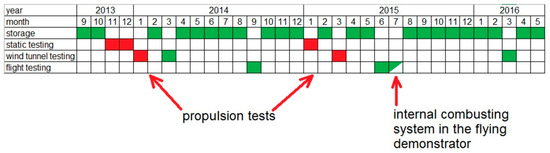 Different discharge characteristics are usually a symptom of battery aging; therefore, it was necessary to decide whether a new set of batteries should be acquired. Market analysis indicated that a suitable piston engine would be lighter and cheaper. Moreover, the maintenance advantage of an electrical propulsion system during a flight test campaign is questionable. Refueling takes significantly less time than exchanging batteries so more flights a day can be performed with internally combusting propulsion. Therefore it was decided to replace electrical propulsion with a piston engine. It was then used until the end of the flight test campaign. The electrical propulsion system was used again during the final wind tunnel test session in 2016. A summary of the electric propulsion system application in this project is presented in Figure 9.