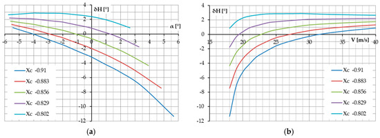 In the case of the airplane being analyzed herein, the CG position was ultimately defined according to the first flight tests that revealed an acceptable but small directional stability. That is why the location of the CG was shifted from an initial xc = −0.879 m to xc = −0.91 m, which increased the distance between the vertical stabilizer aerodynamic center and the CG and therefore improved directional stability, but on the other hand affected the performance. In order to quantify the impact of CG position on performance, we performed the evaluations shown below. First of all, plots of elevator deflection to trim the airplane in steady level powered flight versus the airspeed and angle of attack were defined using the SDSA software developed by Warsaw University of Technology, Poland [56,57] as shown in Figure 13a,b, respectively.