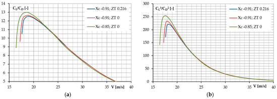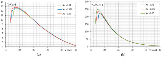The airplane’s aerodynamic characteristics’ variation with the centre of gravity (CG) position: (a) CL/CD ratio; and (b) power coefficient CL3/CD2 with respect to the airspeed.