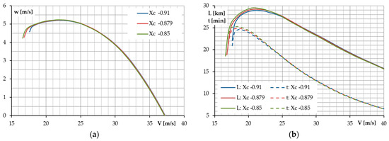 Variation in the airplane’s performance with the CG position: (a) maximum climb rate; and (b) range and flight duration with respect to the airspeed.