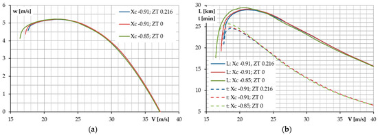 In order to assess the CG position’s impact on the airplane’s performance, additional analyses were performed for two additional CG cases. These were the most aft position that satisfies the assumed stability margin () and equals xc = −0.85 m and the most forward position used during the last flight session: xc = −0.91 m. A comparison of the results with the baseline characteristics presented before in Figure 4 is shown in Figure 15 and Figure 16.