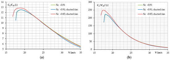 Variation in the airplane’s aerodynamic characteristics with CG position for the configuration with a ducted fan: (a) CL/CD ratio; and (b) power coefficient CL3/CD2 with respect to the airspeed.