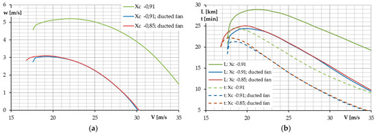 Based on the aerodynamic characteristics of the airframe and propulsion unit characteristics, both retrieved from the wind tunnel tests (Figure 22), the airplane’s performance was calculated in a similar way as described previously and the results are presented in Figure 23 and Figure 24. The first picture shows that there is very minor influence of the ducted fan on the airplane’s overall aerodynamic characteristics. Comparison with the airplane in the baseline configuration reveals only a small difference in CL/CD for the high airspeed range above 29 m/s. Similar to the baseline configuration, the CG shift in the aft direction gives a significant CL/CD and CL3/CD2 ratio increase near the minimum airspeed. The graphs presented in Figure 24 do not confirm that the airplane with the ducted fan is superior over one with conventional propulsion. That is because the propulsion unit being tested and used in the analyses has smaller thrust and efficiency than a conventional propeller used in the flight test program (with greater diameter than the ducted fan). Therefore, it is visible that both the maximum climb rate and range/endurance are worse than in the case with baseline propulsion.